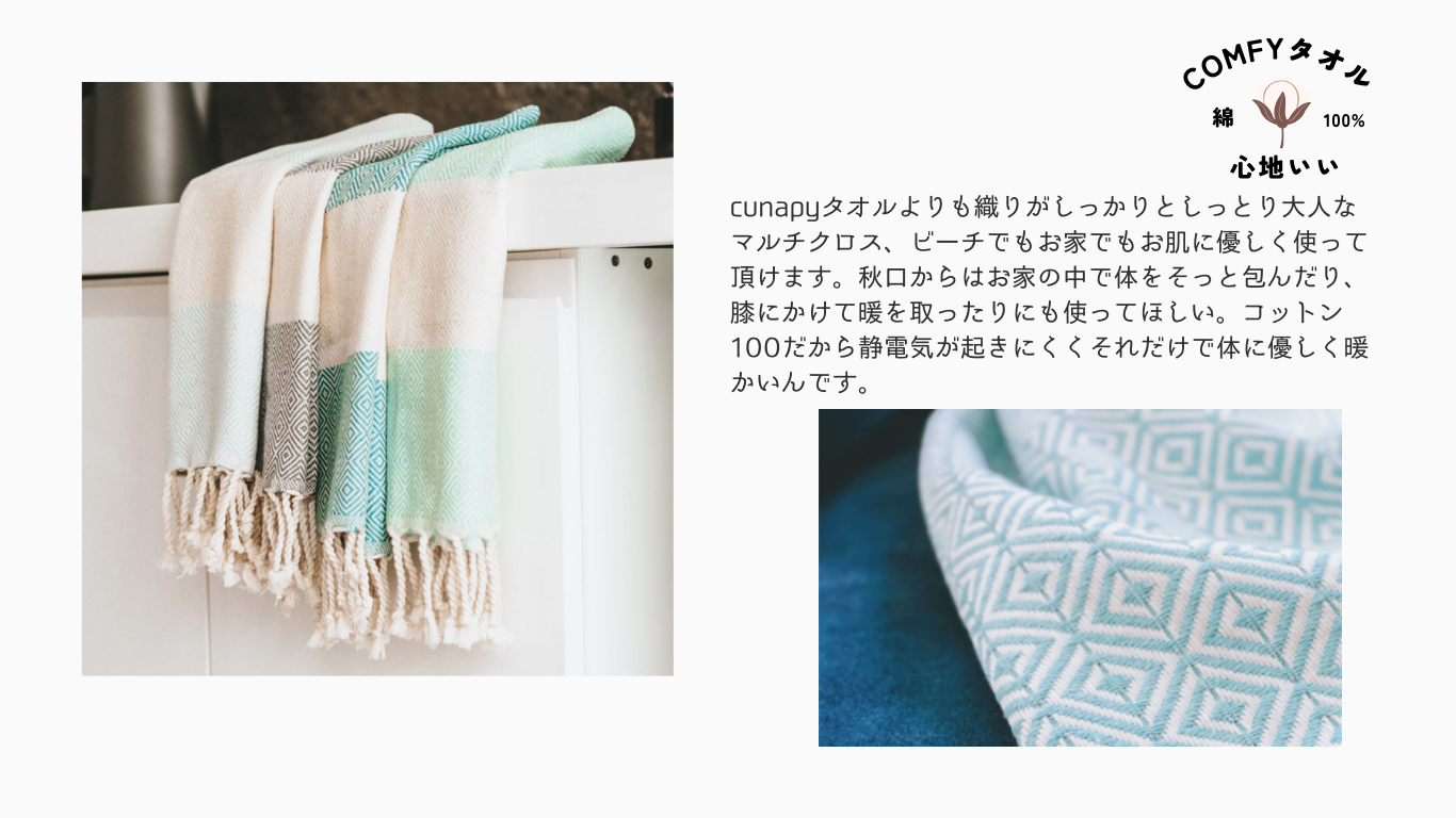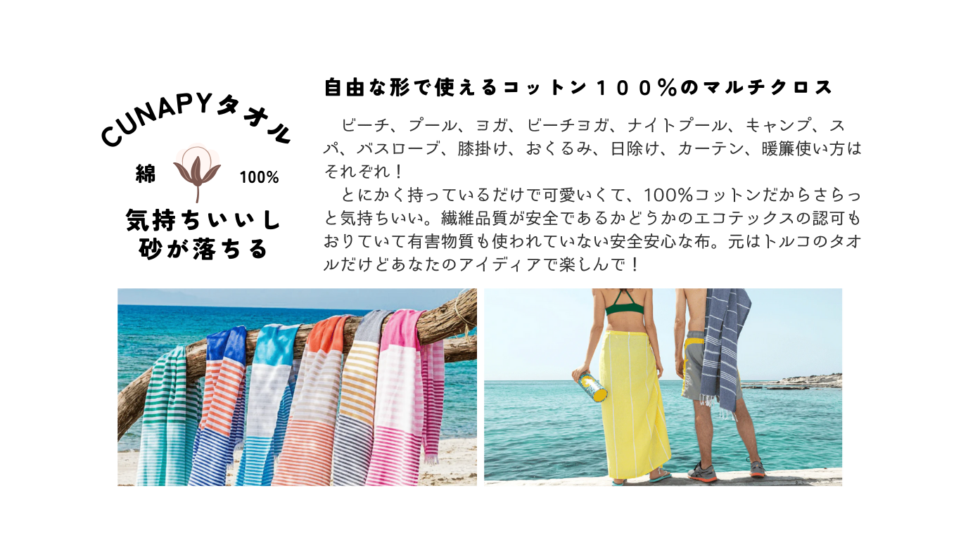 この織布はトルコ語でペシュテマルまたはフータと呼ばれ何世紀にも渡って使用されてきた文化的遺産です。ハマムタオルとも呼ばれその品質や利便性から多くの国のビーチで使われています。様々な特徴を兼ね備え世界中で愛用されるこのペシュテマルがとてもおしゃれになってトルコからやってきました。おしゃれになったその姿はCute「とても可愛く」、コットン100%で生体分解100%「Natural」、そしてタオル、羽織、膝掛け、敷物、スロー、インテリアとしてなど多機能にご利用頂けて楽しい「Happy」という特徴があります。カラフルなデザインの織布にはそれぞれの頭文字2つをとって「Cunapy」。落ち着きのあるしっかりした織の伝統的なデザインにその心地よい肌触りから「Comfy」と名づけました。世界的な繊維の安全度を示すエコテックス スタンダード100の認証も受けておりお肌に優しいのも特徴です。基本的な機能面は一緒です。※吸水性は日本の手ぬぐいに似ています。洗っていくうちに柔らかく吸水性も増してきます。
